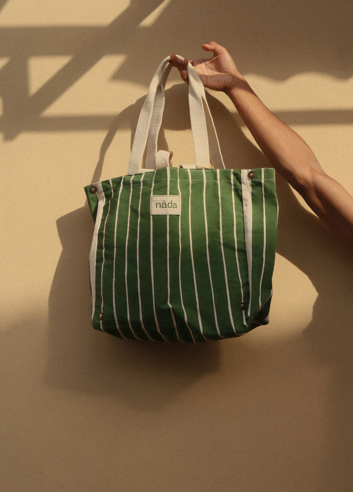 A fresh take on the everyday essential. With bold green canvas and clean ivory stripes, the Green Striped Tote blends utility with timeless style. Finished with the nāda patch, it’s roomy, durable, and designed to carry you from morning markets to café afternoons.
